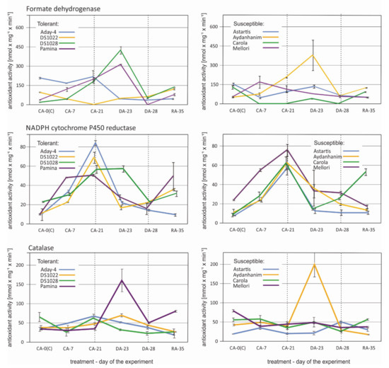 Changes in antioxidant activity of selected enzymes: Formate dehydrogenase, NADPH cytochrome P450 reductase, and catalase in six time points—before cold acclimation (K), during acclimation to cold (CA-0 (C)), during acclimation to cold (CA-7), after 3-week cold acclimation (CA-21), during de-acclimation (DA-23), after 7-day de-acclimation (DA-28), and during re-acclimation to cold (RA-35)in tolerant (left) and susceptible (right) to de-acclimation barley accessions. The de-acclimation period is indicated between the vertical dashed lines.