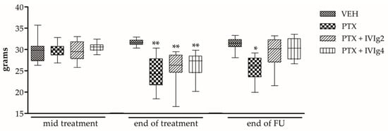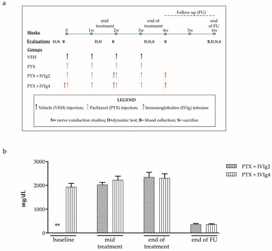 To investigate the therapeutic effect of human immunoglobulins (Ig VENA 50 g/L solution for infusion, ready to use supplied by Kedrion SpA), 48 female Wistar rats were randomized into 4 experimental groups: one group was treated with vehicle for 4 weeks followed by follow up (VEH, n = 12), and three groups were treated with PTX alone (PTX, n = 12) or in co-treatment with two different IVIg schedules (PTX + IVIg2, n = 12; PTX + IVIg4, n = 12) followed by follow up. IVIg were infused at the dosage of 1g/kg the day before PTX treatment at the specific time points described in the flow chart of the study (Figure 1a). In detail, IVIg were infused every two weeks, starting from the first PTX infusion (PTX + IVIg4) or PTX mid treatment (PTX + IVIg2) for a total of three and two administrations, respectively. In particular, rats received 4 mL of IVIg in an infusion time of 10 min. The dosage of human IVIg solution selected for the study is equivalent to the daily dose used in patients affected by acute and chronic inflammatory neuropathies, and derives from a previous study in bortezomib-treated animals [36], where their tolerability and pharmacokinetic were demonstrated.