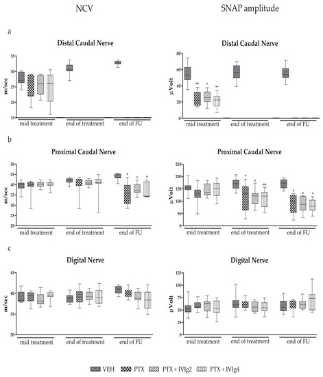 Effects of the IVIg on sensory nerve conduction velocity (NCV) and sensory nerve action potential (SNAP) amplitudes. (a) Proximal caudal nerve NCV and SNAP amplitude. (b) Distal caudal nerve NCV and SNAP amplitude. (c) Digital nerve NCV and SNAP amplitude. ◦ p < 0.05, * p < 0.01, ** p < 0.001 vs. VEH (n = 12 rats/group). All data were analyzed with the Kruskal-Wallis test.