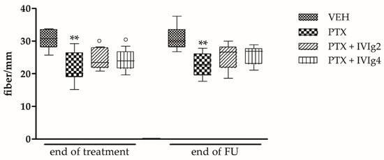 Effects of PTX and IVIg co-treatment on IENF density. IVIg reduces the loss of unmyelinated fibers observed in paclitaxel-treated rats at the end of follow up period. ◦ p < 0.05, ** p < 0.001 vs. VEH (n = 12 rats/group). Data were analyzed using the non-parametric Kruskal-Wallis test.