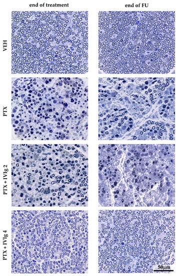 In this part of the study, we analyzed whether IVIg co-treatment was able to revert the distal-to-proximal degeneration pattern typical of PIPN [37]. This analysis was conducted through morphological investigation performed on both distal and proximal caudal nerve segments. In distal caudal nerves, a large number of degenerated fibers were observed in PTX-treated rats both at the end of treatment and follow up period. Similar alterations were observed in proximal caudal nerves, although nerve damage was less prominent in proximal segments compared to distal ones, in agreement with the neurophysiological results. At the end of treatment and after the follow-up period, only the PTX + IVIg4 group showed a reduction in the severity of nerve fiber degeneration in distal caudal nerves vs. PTX alone (Figure 5). However, in proximal caudal nerves, the overall extent of the damage was milder and no effects of the administration of IVIg could be detected. At both experimental time points under investigation, no morphological differences were observed in sciatic nerve and DRG samples of PTX and PTX + IVIg co-treated rats compared to VEH.