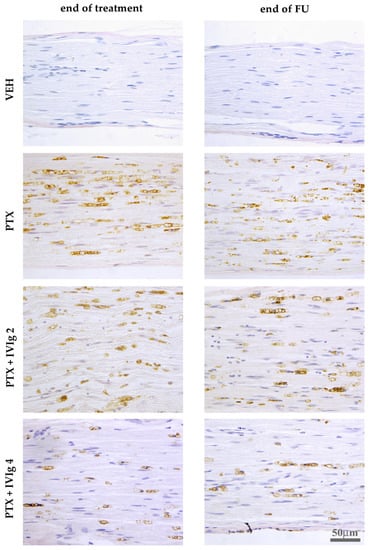 At the end of PTX treatment and after the follow-up period, IHC analysis for CD68 evidenced a more robust macrophage infiltration in distal caudal nerves if compared to proximal segments, while no macrophage infiltration was observed in VEH rats. Only the group co-treated with IVIg starting from the first PTX administration (PTX + IVIg4) showed attenuated macrophage infiltration if compared to the PTX group (Figure 6).