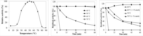 Interestingly, as shown in Figure 3c, the addition of starch (1%) led to an improvement in BCA thermal stability at both of the temperatures (60 and 70 °C). Indeed, after pre-incubation for 60 min at 60 °C, the purified enzyme retained only 17.72% of its activity; however, its full activity was restored in the presence of 1% starch under the same treatment. Moreover, due to the presence of its substrate, the enzyme’s residual activity increased from 0 to 100, 41.5 and 31% after 5, 30 and 60 min of incubation at 70 °C, respectively. Hence, starch may be considered an interesting stabilizer of BCA activity against thermal treatment. Thermostability enhancement of purified α-amylases in the presence of its substrate was supported by the results of Maalej et al. []. Furthermore, Koyama et al. [] reported that low concentrations of starch enhanced thermostability of the human salivary α-amylase (HSA) which binds starch, forming an enzyme–substrate complex that stabilizes the enzyme.