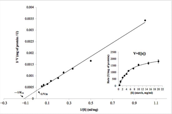 Lineweaver–Burk plot for the BCA α-amylase from blue crab viscera. Starch concentration varied in the range of 0–20 mg mL−1. Km and Vmax values were calculated from the plot. Inset shows the V = f ([S]) plot.