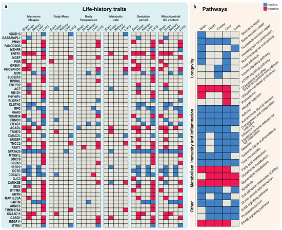 (a) Top linear correlations for species features and gene expression. The heatmap represents significant statistical associations (FDR < 0.05, R2 > 0.3) between the expression levels of specific genes with MLS and other life-history traits, in different organs. Included are the 50 genes with the highest maximum coefficient of determination (maximum R2 across all organs) for predicting MLS (full list of genes associated with lifespan and other species features in Supplementary Table S2). (b) Top linear correlations for MLS and pathway enrichment scores. The heatmap represents the significant associations between MLS and the computed enrichment score (ES) for pathways, obtained using the signature projection approach, which takes into account the expression of all the expressed genes belonging to each pathway. The presented pathways are grouped by categories and include the following: 1) preselected pathways that had been previously shown to be associated with longevity (by independent studies), and 2) additional pathways identified by the current analysis to be associated significantly with MLS in at least four organs. Quantitative details on pathway score associations with other species features can be found in Supplementary Table S3. (a,b) Red represents significant positive associations for genes or pathways; blue represents significant negative associations. Colorless represents no significant associations found in this study.