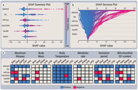 In the non-linear approach, to explain how the genes with the highest composite ranking impact MLS, multiple LightGBM-SHAP models were built with different numbers of top-ranked genes. According to the threshold criteria described in the methods, the top-six genes model was considered most significant, having the lowest number of genes, while having the highest increase in model performance. Upon the training of this stage III LightGBM-SHAP model, average Huber loss = 6.41, MAE = 7.45, MSE = 233.6 and R2 = 0.67 were achieved in a five-fold cross-validation with genes CEL, SPATA20, C6orf89, NOXA1, CALCOCO2 and PPP1CA. Unlike the top genes of the stage II model (Figure 3a), the SHAP distribution of the six genes was more balanced, all genes having both positive and negative SHAP impacts, while better separated clustered samples for pro-MLS (CEL, SPATA20, NOXA1, CALCOCO2) and anti-MLS (C6orf89, PPP1CA) genes could be visually observed (Figure 4a,b). As shown in Figure 4c, the top six genes from the multi-model analysis correlate with systemic features. Remarkably, all six genes, in all five organs, correlate with body temperature, which was previously shown to be an independent determinant of mammalian longevity [17].