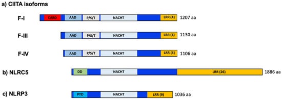 Domain structure of nucleotide-binding and leucine-rich-repeat (NLR) proteins CIITA (a), NLRC5 (b) and NLRP3 (c). Abbreviations: AAD, acidic activation domain; CARD, caspase activation and recruitment domain; DD, death domain; F-I, F-III, F-IV, isoforms-I, -III and -IV; LRR, leucine-rich repeats; NACHT, NAIP, CIITA, HET-E, TP1 domain; P/S/T, proline-serine-threonine rich domain; PYD, pyrin domain.
