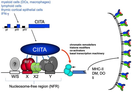 - Otten, L.A.; Steimle, V.; Bontron, S.; Mach, B. Quantitative control of MHC class II expression by the transactivator CIITA. Eur. J. Immunol. 1998, 28, 473–478. [Google Scholar] [CrossRef]