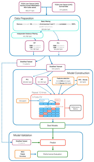 Methylation data were processed and filtered as described in the datasets section. To test whether reducing the number of variables in an unsupervised manner would have improved the classification performance, we started with an independent variance filtered dataset (IVF) (basic filtering + variance filtering) and a basic filtered dataset (ALL). Then both datasets were split into 80% training and 20% test partitions in a stratified manner, making sure that the pair of classes were present in both partitions and in equal proportion. The training set was used in the model construction step while the testset was kept aside to perform the model validation.