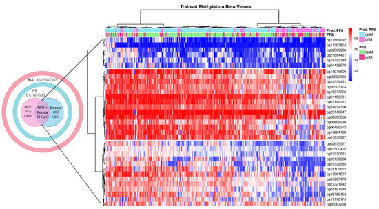 Conclusively, the RF model (RFE∩Boruta + RF) showed the best performance metrics and 34 CpG probes (Figure 2) were selected as final predictive markers for PFS prediction.