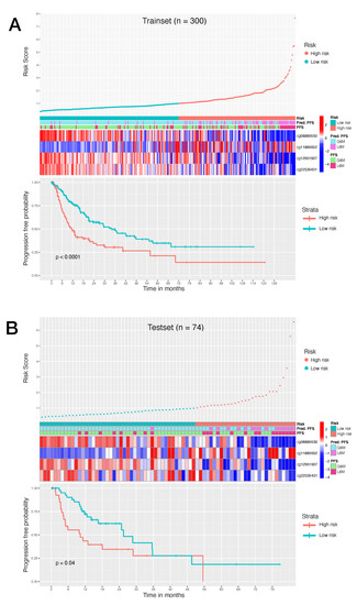 The corresponding risk scores of each trainset patient were calculated using the formula and the samples were stratified into high-score and low-score groups based on the risk score = 1 as cutoff. Next, we used Kaplan–Meier survival analysis to assess the prognostic impact of the model in the risk stratified trainset. The relationship between PFS time and risk score was statistically significant, with patients at high risk of progression (n = 137) showing a considerable adverse PFS with respect to the patients at low risk of progression (n = 163). This trend appeared as particularly visible during the first 12 months (Figure 4A). Patients at high risk of progression had a significantly increased risk of disease progression.