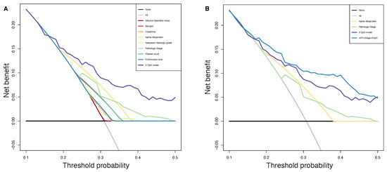 Decision curve analysis. The plot shows the net benefit per patient relative to no intervention for any patient (“treat none”). The unit is the benefit for a patient who would have a PFS less than 6 months without intervention and who receives the intervention. Black line: assume no patient has a PFS less than 6 months. Grey line: assume all patients have a PFS less than 6 months. (A): All parameters are reported, purple line representing our CpGs based method achieving higher benefit than in-use parameters. (B): Pathologic stage, preoperative AFP, 4 CpGs risk score and model including all these three variables are reported, blue line shows that the benefit was even higher when we combined our model to strong prognosis factors.