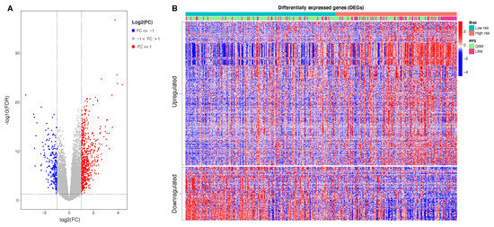 With the aim to understand the functional significance of the proposed epigenetic 4 CpGs score, we evaluated the putative gene expression modulation between the two epigenetic risk categories. To do this, we performed a DEG analysis. Patients at low risk of progression were used as reference. A total of 850 DEGs were identified, consisting of 619 upregulated genes (FDR < 0.05 and logFC ≥ 1) and 231 downregulated genes (FDR < 0.05 and logFC ≤ 1). In Figure 6, we reported the heatmap of DEGs in which patients are ordered in accordance with the calculated risk score. Of note, as the risk score increases (from the left to the right of the heatmap), the fold change increases in upregulated genes and decreases in downregulated genes. In Table A4, we reported the top 25 upregulated and downregulated genes in patients at high risk of progression compared to patients at low risk of progression.