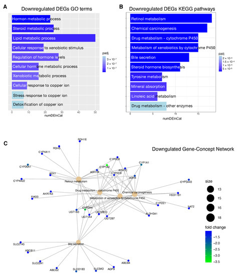 In Figure 7C and Figure 8C, we reported the Gene-Concept Network of the main downregulated and upregulated KEGG pathways in patients at high risk of progression. Downregulated genes included several clusters of metabolic genes such as: alcohol dehydrogenases (ADH) genes that are involved in alcohol metabolism, uridine diphosphate glucuronyl transferase (UGT) genes which play roles in phase II drug metabolism and cytochromes (CYPs) P450 genes that catalyze the oxidation and metabolism of a large number of xenobiotics and endogenous compounds. Within downregulated genes, we also found solute carriers (SLC) and ATP-binding cassette (ABC) proteins that play an essential role in the uptake and in the export of a large variety of anti-tumor drugs, respectively.