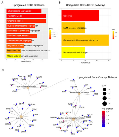 Functional enrichment analysis of upregulated DEGs in patients at high risk of progression. (A): Top 10 GO terms plotted in order of adjusted p-values (BH). Bar size represents the number of significant DEGs that fall within a GO category (numDEInCat) and color represents the adjusted p-values (BH). (B): KEGG pathways are ordered by adjusted p-values (BH), bar size represents the number of significant DEGs that fall within a KEGG pathway (numDEInCat) and color represents the adjusted p-values (BH). (C): Gene-Concept Network. The size of the KEGG pathways stands for the number of DEGs that fall within each pathway. Color scale of gene names stands for the -fold change of DEGs in the high risk of progression group compared to the low risk of progression group.