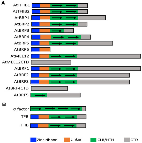 The expansion of TFIIB-like proteins in plants is intriguing but not completely surprising given their structural, functional and evolutionary relationship with bacterial σ factors and archaeal transcription factor B (TFB). Multi-subunit DNA-dependent RNA polymerase proteins for gene transcription are conserved in bacteria, archaea, and eukaryotes. Bacterial RNA polymerase holoenzyme consists of the RNA polymerase core enzyme and a σ factor [11,12]. On binding to the RNA polymerase, bacterial σ factors allow efficient promoter recognition and transcription initiation. It is the σ factor that determines which bacterial genes to be transcribed [11,12]. Archaeal RNA polymerase is more complex with 14 subunits and utilize TFB-TBP rather than σ factors for recognition of target genes and transcription initiation [11,12]. Structural and evolutionary analysis has revealed that bacterial σ factors, archaeal TFB and eukaryotic TFIIB are homologs [11]. TFIIB and TFB each have two five-helix cyclin-like repeats (CLR) that include a C-terminal helix-turn-helix (HTH) motif (CLR/HTH domains) [11] (Figure 1B). A total of four homologous HTH motifs are also present in bacterial σ factors that are relics of CLR/HTH domains [11] (Figure 1B). Bacteria contain a primary σ factor and many alternative σ factors for coordinated expression of discrete sets of genes [13,14,15]. Archaea also have an expanded TFB protein family that potentially mediate environmental responses (e.g., heat shock and oxidative stress) of archaea [11]. In fact, the exceptional success of many archaea in environmental extremes has raised the hypothesis that expansion of the general transcription factors in these organisms might partly or fully explain their extraordinary niche adaptation capability [11].