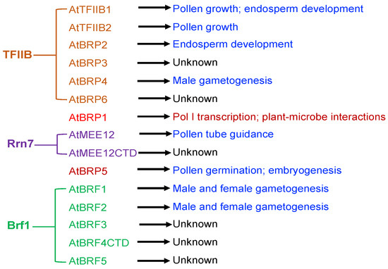 - Zhang, K.; Yang, W.; Yu, H.; Fu, C.; Liu, X.; Liu, J. Double mutation of BRF1 and BRF2 leads to sterility in Arabidopsis thaliana. Biochem. Biophys. Res. Commun. 2019, 516, 969–975. [Google Scholar] [CrossRef]