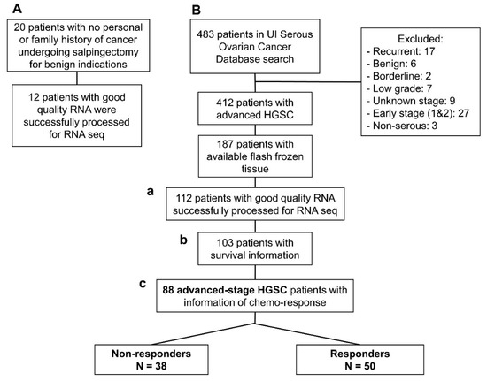 Flow-chart of patients included in this study: (A) Normal fallopian tube samples from women undergoing contraceptive procedures. (B) Patients with high-grade serous ovarian cancer (HGSC) from the Women’s Health Tissue Repository: (a) 112 patients with HGSC and successful RNA-seq that were included in the comparison with lncRNA extracted from normal tubes; (b) 103 HGSC patients with successful RNA-seq that had outcome and follow-up data necessary for the survival analysis; and, (c) 88 advanced stage, high-grade, HGSC with data about chemotherapy response based on the definition stablished in the Methods section.