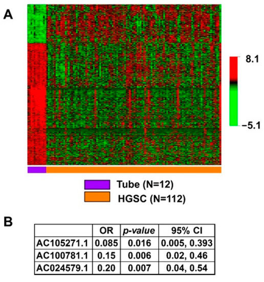 We identified 16,325 lncRNA sequences from the extracted RNA of 112 HGSC and 12 normal tube samples (Figure 1). In Figure 2A, we present the 1943 lncRNA sequences that were differentially expressed in HGSC as compared to normal Fallopian tube controls (p < 0.001). Of these 1943 sequences, three were significant after the multivariate logistic regression analysis (Figure 2B). All three demonstrated decreased expression; evidence of decreased regulation within the tumor.