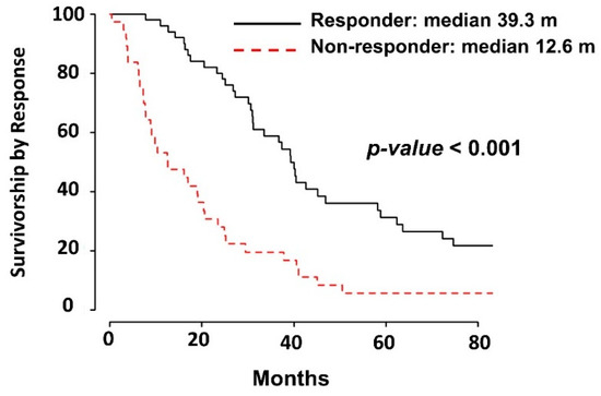 Kaplan–Meier survival curve based on response to chemotherapy: Median survival of 39.3 months for responders and 12.6 for non-responders.