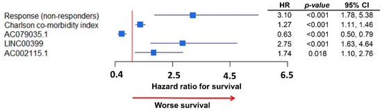 Forest plot of the integrative multivariate model with clinical data and lncRNA expressions: Response to chemotherapy remained highly associated (HR: 3.1) with survival; LINC00399 was the lncRNA with highest association with survival (HR: 2.75).