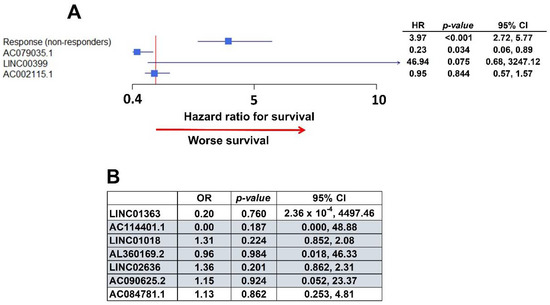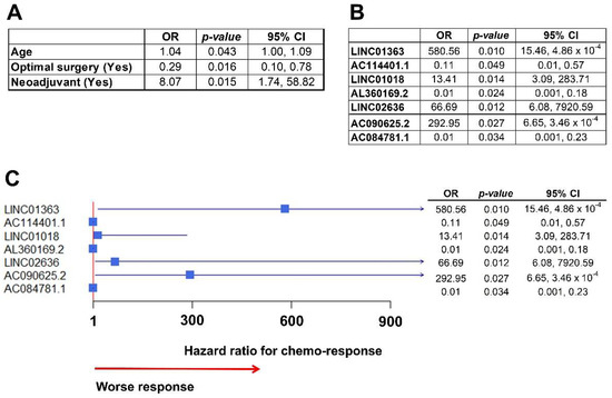 In the multivariate analysis to assess the association between lncRNA expression and response to chemotherapy, seven lncRNAs were significantly associated with chemo-response (Figure 5B). Subsequently, we built an integrative multivariate logistic model, including independently significant clinical and molecular variables (lncRNAs). When put together only lncRNAs remained independently significant, and the clinical variables dropped from the model (represented in Figure 5C forest plot). Notably, three lncRNAs were highly associated with worse chemo-response, with OR over 65 (LINC02636) and up to 580 (LINC01363).