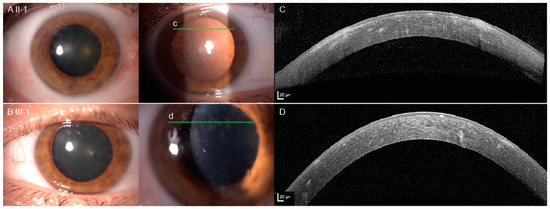 Slit lamp pictures (A,B) and the anterior segment optical coherence tomography (C,D) of the patients II-1 and III-1. The lines c and d mark the location of the optical coherence tomography (OCT) scans. Note the thick anterior and midstromal filaments on the OCT.