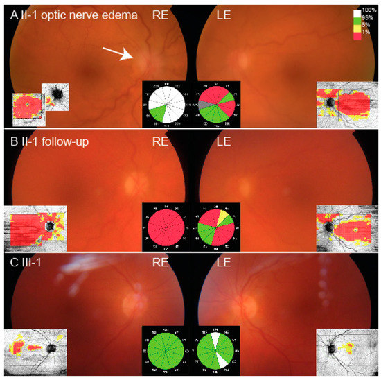 Fundus images of the patient II-1 (A,B) and III-1 (C). Note the optic nerve edema (white arrow) and vascular tortuosity on presentation in patient II-1 (A) which resolved on follow-up 7 weeks later (B). The circles placed in the middle represent the thickness of the peripapillary retinal nerve fiber layer where the average thickness of each sector is noted with number in micrometers. The ganglion cell layer thickness in the macula is shown on the side of each fundus image. The different colors represent the comparison of measured thickness with the normative data (with the red color representing thickness observed in less than 1% of the population (see color coded legend placed at the top right corner of the figure)). N/A = not available.