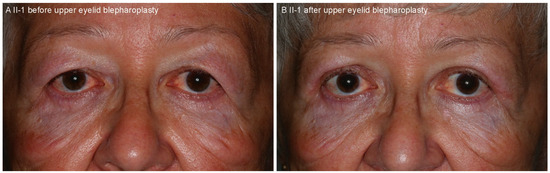 The facial appearance of the patient II-1 before (A) and after (B) the upper eyelid blepharoplasty. Note the loose skin (cutis laxa) of the upper and lower eyelids, characteristic for gelsolin amyloidosis.