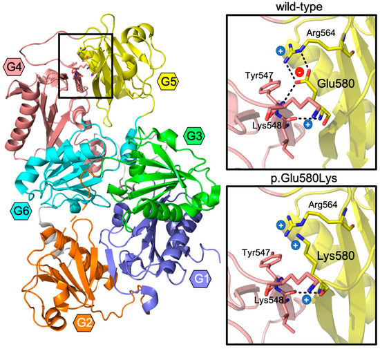 To evaluate the impact of the mutation on the structure of the protein, we built an in silico model of the p.Glu580Lys variant (Figure 4). The p.Glu580 residue belongs to the G5 protein domain and locates at the interface between this and the fourth domain. In the wild-type protein, it plays a crucial role for the maintenance of the G4–G5 interaction, forming a salt-bridge with p.Arg564 and H-bonds with other residues of the G4. According to the model, in the p.Glu580Lys variant, the mutated residue is not able to maintain most of these interactions, with a significant loss of connectivity and stability. Moreover, the Glu to Lys substitution leads to a local inversion of the charge, from negatively to positively charged, in an area of the protein where other positively charged residues cluster, likely causing electrostatic repulsion.