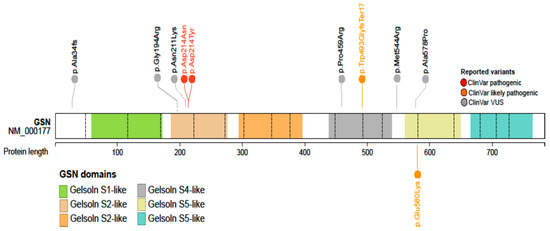 GSN variants with their location in the GSN protein and their pathogenicity designation according to the ClinVar database (Available online: ncbi.nlm.nih.gov/clinvar/ (accessed on 5 December 2020)). The phenotypes that were reported in association with these variants are listed in Table 2. Note the mutation p.Trp493GlyfsTer17 that was designated as likely pathogenic but not yet described in patients in the literature.