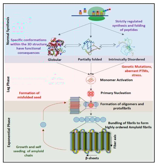 The mechanism of formation of amyloids: The organization of proteins into globular, partially folded or intrinsically disordered functional conformations is a tightly regulated process. However, mutations, aberrant cleavage or cellular stress can cause the formation of altered monomeric species. This event, known as monomer activation, destabilizes the native structure and forms the thermodynamically favorable β-sheets rich structure. The combination of these altered structures, or primary nucleation, leads to the formation of various multimers, protofibrils (2.5 to 3 nm in diameter), and fibrils (6 to 10 nm). The intertwining of protofibrils and fibrils leads to the formation of highly stable mature amyloid fibrils (60–120 nm). The primary event of nucleation and fibril formation is relatively slow and is referred to as the lag phase of growth. As more native proteins mimic the structure of misfolded seeds, the growth of amyloid fibrils reaches an exponential phase leading to rapid accumulation of aggregates [7,8].