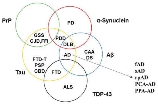 Involvement of known prion-like proteins in multiple neurodegenerative disorders. The figure depicts the overlapping pathological profile of PrP (green circle), α-Synuclein (red circle), Aβ (blue circle), Tau (yellow circle), and TDP-43 (black circle). Each of the stated disorders have further clinical variants (as shown in the case of AD), thereby complicating the role of prion-like proteins in bringing about the observed pathology. PDD—Parkinson’s disease with dementia; DS—Down’s syndrome; FTD-T—frontotemporal dementia with tau pathology; fAD—familial AD; sAD—sporadic AD; rpAD—rapidly-progressive AD; PCA-AD—posterior cortical atrophy–AD; PPA-AD—primary progressive aphasia with AD.