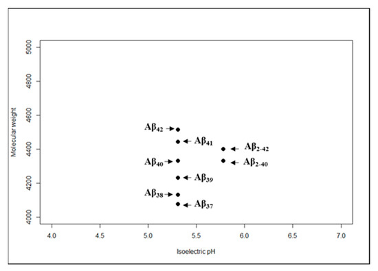 - Maler, J.M.; Klafki, H.-W.; Paul, S.; Spitzer, P.; Groemer, T.W.; Henkel, A.W.; Esselmann, H.; Lewczuk, P.; Kornhuber, J.; Wiltfang, J. Urea-based two-dimensional electrophoresis of beta-amyloid peptides in human plasma: Evidence for novel Aβ species. Proteomics 2007, 7, 3815–3820. [Google Scholar] [CrossRef]