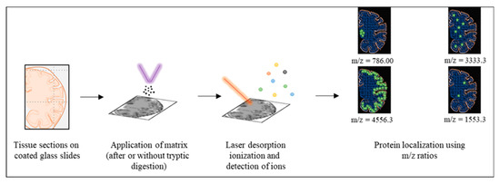 The preparation of samples for MALDI-IMS is relatively straightforward. It involves sectioning of tissues and their mounting on indium-tin oxide coated slides. Ethanol fixation is employed to limit the delocalization of proteins. Impurities, like salts and lipids, are removed using a combination of organic solvents, and the tissue is coated with trypsin (if digestion of the analyte is required). The matrix is selected based on the size and biochemical attributes of the target analyte and uniformly coated on the tissue using automated sprayers followed by analysis. Simultaneously, the same tissue can be stained using cresyl violet, hematoxylin and eosin, methylene blue, or immunohistochemistry to visualize the cellular population. These stained images can be overlaid with MALDI-IMS images to assign each protein to a certain cellular population or region of interest. There are several reviews and methodology papers available for fine-tuning the protocols according to the requirements of each protein [100,102].