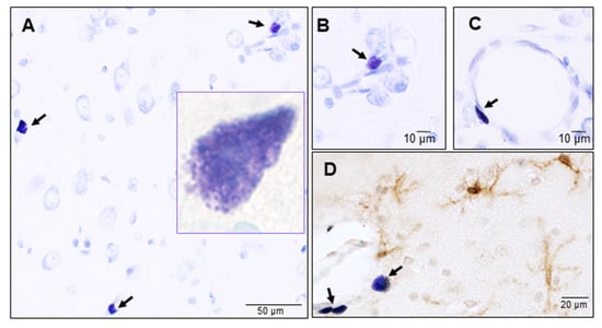 Mast cells in the naïve rat brain. Mast cells were identified by toluidine blue staining and their typical metachromasia. (A) Mast cells at the level of thalamus, inset shows a high magnification view of a granulated parenchymal mast cell; (B) A roundish mast cell around a small blood capillary; (C) An elongated mast cell in close proximity to a larger blood capillary; (D) Mast cells in close association with microglia (identified by an antibody against the ionized calcium binding adaptor molecule-1 (Iba-1) brown stain) in the brain parenchyma. Arrows indicate toluidine blue stained mast cells. Shown in panel D is a roundish mast cell and two elongated mast cells in close proximity to a blood capillary.