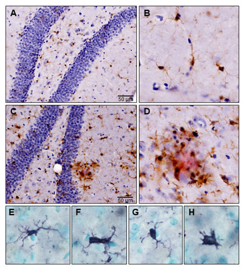- Hanisch, U.-K.; Kettenmann, H. Microglia: Active sensor and versatile effector cells in the normal and pathologic brain. Nat. Neurosci. 2007, 10, 1387–1394. [Google Scholar] [CrossRef] [PubMed]