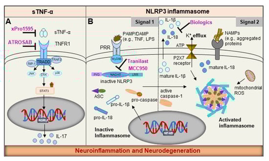 Schematic representation of potential therapeutic approaches targeting common pathways in mast cells and microglia. Tumor necrosis factor (TNF) signaling and the NLRP3 inflammasome, represent the two common pathways that can be targeted to dampen inflammation. (A) ATROSAB, a TNFR1-specific antagonist and xPro1595, a neutralizing antibody specifically inhibit soluble TNF-α; (B) Biologics, namely recombinant IL-1β receptor antagonist (Anakinra), IL-1β neutralizing antibody (Canakinumab) and a soluble decoy receptor that binds IL-1β (Rilonacept) are in clinical use. Tranilast (Rizaben) and MCC950 have been identified as specific inhibitors that binds to the NOD domain (also referred as the NACHT domain) of the NLRP3 and inhibit inflammasome assembly and activation, in turn, inhibiting the vicious cycle of neuroinflammation and neurodegeneration.