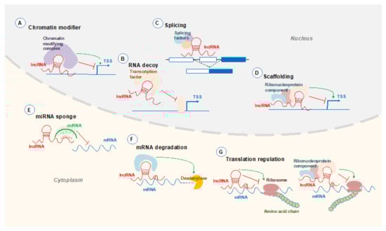 Mechanisms of lncRNAs. LncRNAs (in red) function in the nucleus and cytoplasm to act on transcriptional, post-transcriptional and translational levels. Within the nucleus, lncRNAs can regulate transcription through (A) recruiting chromatin modifying complexes to supress or activate transcriptional start sites (TSS) or (B) modulating transcription factor activity. LncRNAs can also (C) interact with mRNA to alter splicing events and (D) act as a scaffold and bind numerous proteins to form a ribonucleoprotein complex which can regulate transcription within the nucleus and (G) translation in the cytoplasm. In the cytoplasm, lncRNAs can also regulate gene expression post-transcriptionally by (E) acting as a microRNA (miRNA) sponge or interact with mRNA to (F) promote degradation or (G) regulate translation [].
