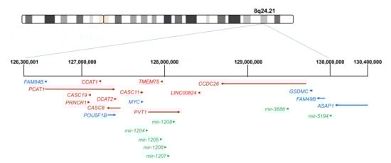 - Huppi, K.; Pitt, J.J.; Wahlberg, B.M.; Caplen, N.J. The 8q24 Gene Desert: An Oasis of Non-Coding Transcriptional Activity. Front. Genet. 2012, 3, 69. [Google Scholar] [CrossRef]