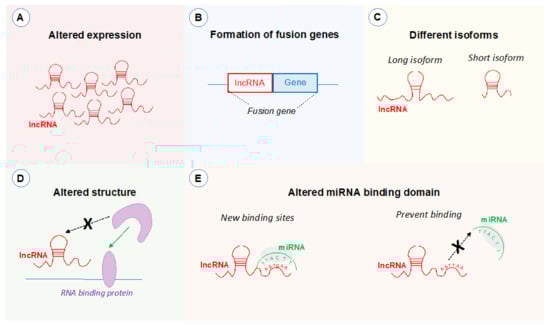 Potential effects of genetic variants on 8q24.21 lncRNA expression and function. (A) Copy number gains or single-nucleotide polymorphisms (SNPs) within the promoter region can alter the expression of lncRNAs (in red). (B) Chromosomal translocations can lead to the formation fusion genes containing 8q24.21 lncRNAs. (C) An intronic SNP can result in different lncRNA isoforms being expression including short and long versions of the lncRNA. SNPs located in intronic or exonic regions can result in changes in the structure, therefore (D) preventing binding to proteins, or (E) alterations in the miRNA binding domains resulting in either new binding sites or preventing binding to target miRNAs.
