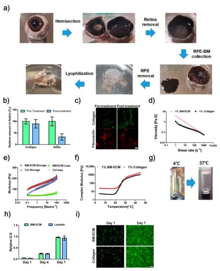 The RPE cells were cultured on BM-ECM-coated Transwell and compared with those on laminin-coated Transwell. Similar proliferation was observed in both groups, and no dead cells were observed, which means that the developed BM-ECM is non-toxic (Figure 1h,i).
