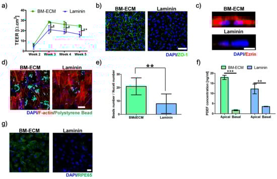 To evaluate the functionality of the RPE, the ability of the phagocytosis was compared between RPE cells cultured on BM-ECM and laminin-coated Transwells. Each sample was incubated with 2 μm of fluorescence-labeled polystyrene bead (Invitrogen) at a concentration of 1 × 107/mL for 16 h. After incubation, RPE cells were washed with PBS three times to remove undigested beads. The cells were fixed with 4% paraformaldehyde solution for 20 min and permeabilized with 0.03% Triton-X for 7 min at room temperature. After permeabilization, the samples were incubated with DAPI and TRITC phalloidin (Sigma-Aldrich). Imaging was carried out using a confocal microscope (Zeiss).