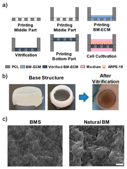 We have developed a BM-ECM bioink that can offer optimized ECM components for the maturation of RPE cells. Compared with conventional laminin-coated Transwell, the RPE cells on BM-ECM-coated Transwell showed enhanced functionality and performance. Furthermore, using 3D printing technology, we developed BMS that can provide a similar structure and ECM environment for RPE cells—allowing cells for maturation and maintenance of functionality—while also reducing the culture period. In addition, the developed cultivation system could be used as an experimental transplantation platform. Therefore, the BMS is an appropriate candidate to develop the functional RPE cell formation for both the in vitro model and transplantation.