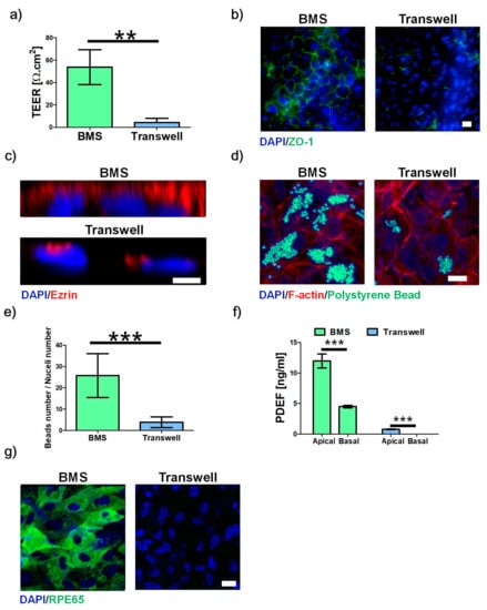 Effect of BMS on RPE maturation. (a) TEER value, (b) ZO-1 expression for tight junction, (c) ezrin expression for microvilli formation, (d) digested polystyrene beads for phagocytosis activity, (e) counted number of beads to nuclei ratios, (f) PEDF secretion for polarized secretion, and g) RPE65 formation for phototransduction in RPE cells on BMS or BM-ECM-coated Transwell (Transwell) at day 10. Scale bars: 20 μm (a,c,g), 5 μm (b). The error bars represent the standard deviation. The data were compared using Student’s t-test and differences were considered significant when ** for p < 0.01, and *** for p < 0.001 (n = 3).
