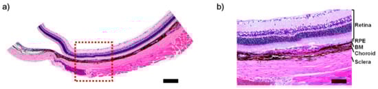 Histology image of a rat with subretinal implanted BMS. (a) H&E staining of the implanted BMS. (b) Magnification of subset (red box). Scale bars: (a) 500 μm; (b) 100 μm.