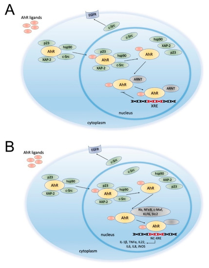 After ligand binding, AhR dissociates from its chaperones (e.g., proto-oncogene tyrosine-protein kinase c-Src, heat shock protein 90 (HSP90), p23, and the hepatitis B virus X-associated protein 2 (XAP2)) and undergoes conformational changes, resulting in the exposition of the nuclear translocation signal and induction of AhR transport into the nucleus (Figure 1A) [23].