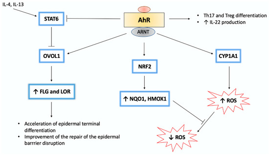 Molecular interactions within the AhR signaling pathway [99]. In the nucleus, AhR/ARNT complex binds to the XRE sequence, thus initiating the transcription of AhR-responsive genes, such as CYP1A1. CYP1A1 activity is associated with ROS production. Furthermore, AhR ligands are degraded by CYP1A1. Regarding chemically stable ligands, such as dioxins, sustained CYP1A1 activation leads to enhanced ROS generation. On the other hand, several AhR ligands activate nuclear factor-erythroid 2-related factor-2 (Nrf2), a transcription factor, which induces expression of antioxidative enzymes (e.g., heme oxygenase 1 (HMOX1) and NQO1). Moreover, AhR signaling is associated with the differentiation of immune cells, such as Th17 and Treg. Regarding inflammatory skin diseases, such as psoriasis and atopic dermatitis, AhR-mediated IL-22 production plays a crucial role in alleviating skin lesions. AhR/ARNT interaction upregulates filaggrin (FLG) and loricrin (LOR) expression via activation of the OVO-like 1 (OVOL1) transcription factor. Both FLG and LOR play a key role in epidermal differentiation. However, IL-4/IL-13-mediated signal transducer and activator of transcription 6 (STAT6) activation inhibits the OVOL1/FLG/LOR pathway. AhR stimulation may inhibit STAT6 and upregulate FLG and LOR expression. The pathogenic implication of AhR signaling in inflammatory skin diseases is not fully understood as the activation of the AhR/OVOL1/FLG/LOR pathway may become harmful. As the use of rapid metabolizing AhR ligands, such as FICZ, may alleviate skin inflammation, sustainable activation of this pathway by dioxins exacerbates epidermal barrier dysfunction. The scheme is based on previously reported data [9,10,84,99]. ↑-activation, upregulation, ↓-downregulation, T-arrow-inhibition.