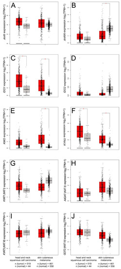 - Tang, Z.; Kang, B.; Li, C.; Chen, T.; Zhang, Z. GEPIA2: An enhanced web server for large-scale expression profiling and interactive analysis. Nucleic Acids Res. 2019, 47(W1), W556–W560. [Google Scholar] [CrossRef]
