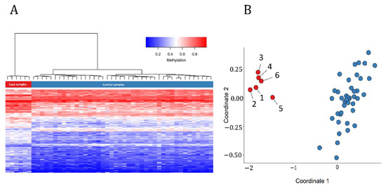 Assessment of the strength of the identified episignature in distinguishing intellectual developmental disorder, X-linked, syndromic, Armfield type (MRXSA) case subjects from controls. (A) Hierarchical clustering with Ward’s method on Euclidean distance was performed. In the heatmap, each row illustrates a selected CpG site, and each column is related to a sample. The heatmap pane represents the phenotype. The heatmap color scale indicates the range of methylation level; from blue (no methylation or 0) to red (full methylation or 1). This plot conveys that the detected episignature clearly differentiates between case and control subjects. (B) Multidimensional scaling plot using the selected probes, illustrating the power of the signature in separating the case and control groups. Blue circles represent healthy control subjects and red circles indicate subjects with a confirmed diagnosis of the syndrome.